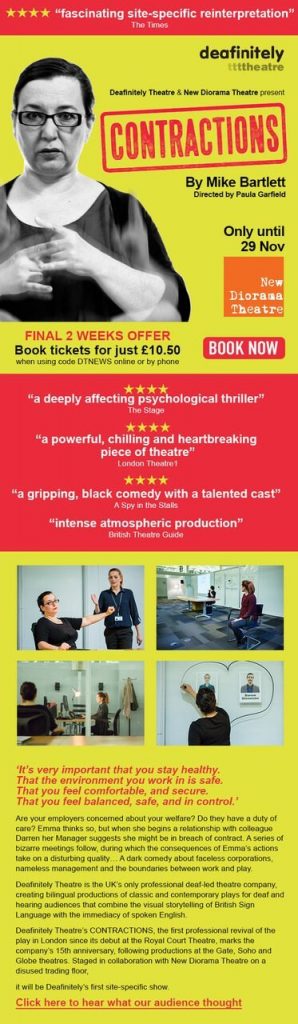 Deafinitely Theatre’s latest production is coming to an end (29th Nov), but there’s still time to get to see it. There is even a special ticket price to encourage you! (£10.50 by quoting DTNEWS) If that wasn’t enough, the production has recently been nominated for two awards in the Offies – the Off West End…